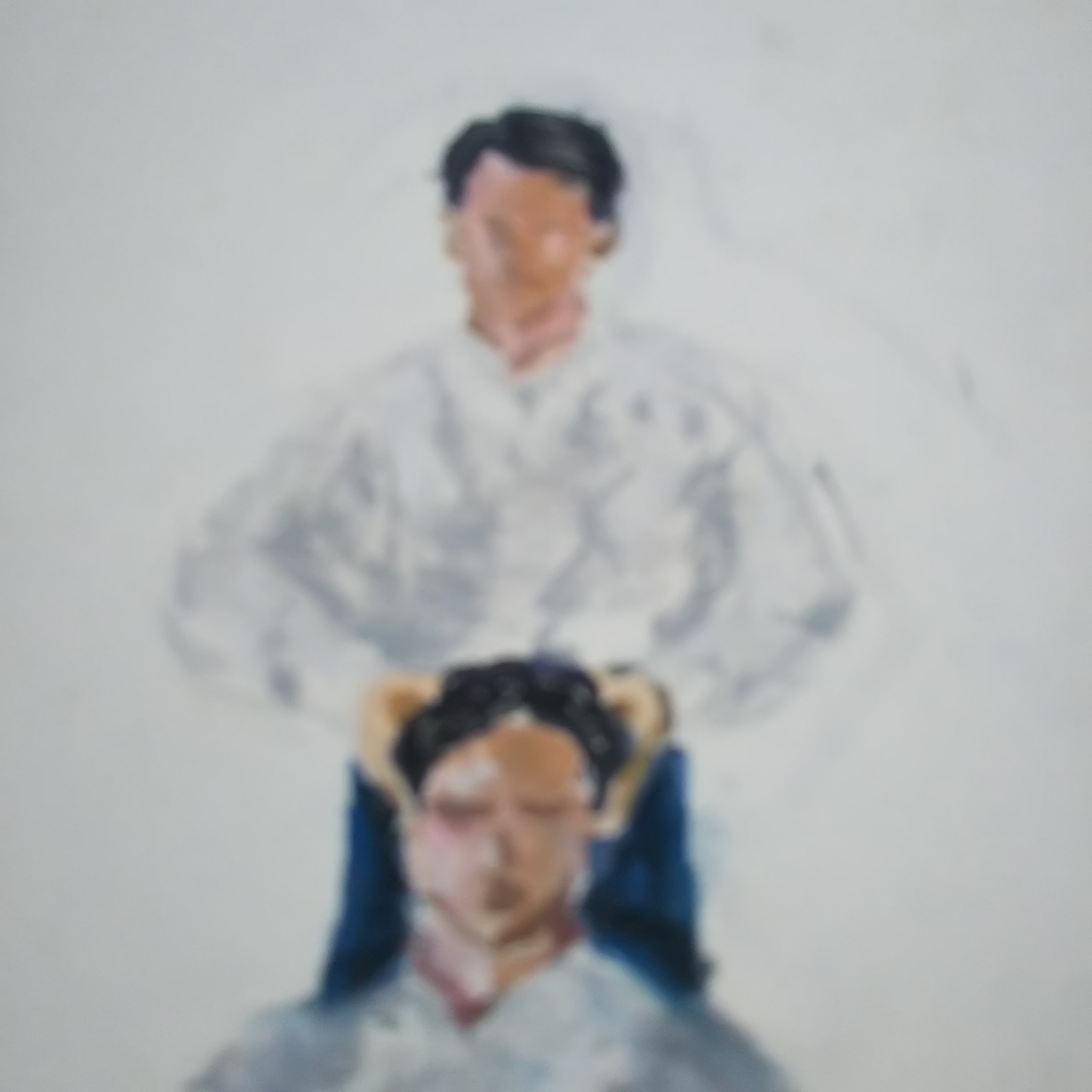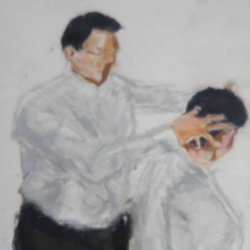 相手に座ってもらい、背後から四指を側頭部に当て左右の親指で愉氣します。