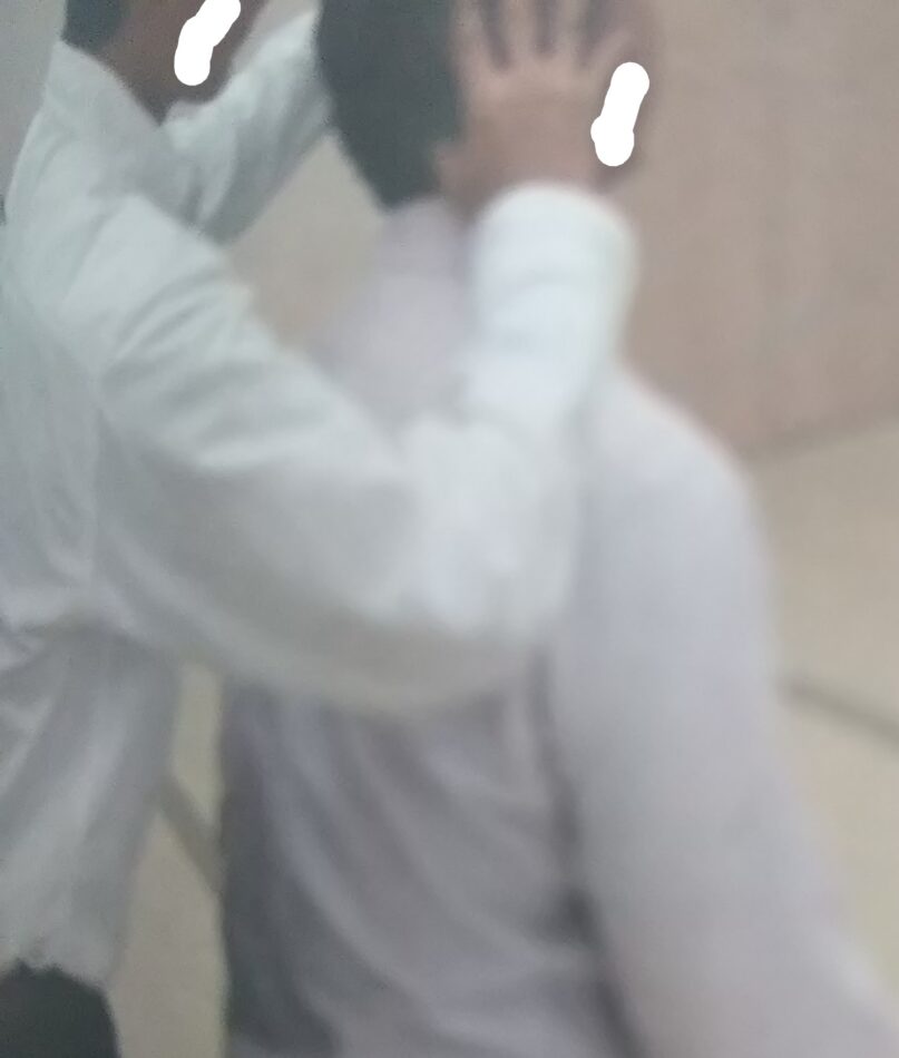 相手に座ってもらい、調整をする方は画像のように背後から親指を後頭骨に当て、残りの四指を耳を塞がないように添えます。