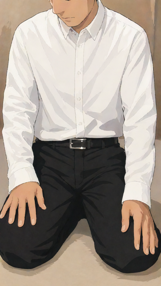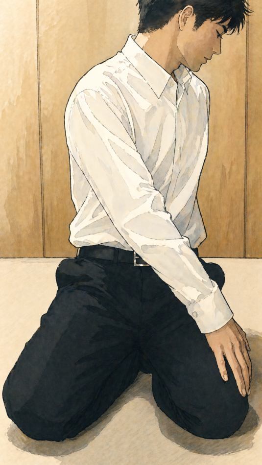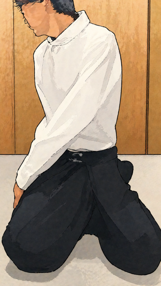正座の姿勢から息を吸いながら左に捻じり、吸いきったら力を抜いて戻す。